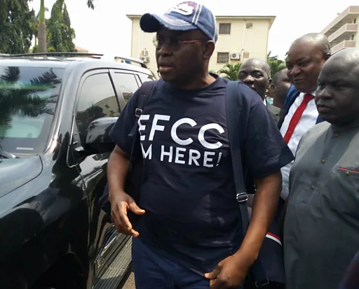 Fayose ko tilẹ jẹ ki wọn wa ki o to yọju si ile iṣẹ ajọ naa ni Abuja ti o si wọ aṣọ dudu ti wọn kọ akori "EFCC I am here" si.