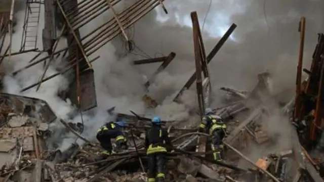 Akọroyin BBC Paul Adams to wa ni ilu naa sọ pe awọn oṣiṣẹ adoola n tu ile aṣẹku ile alaja marun un kan to dawo lati doola awọn eeyan.