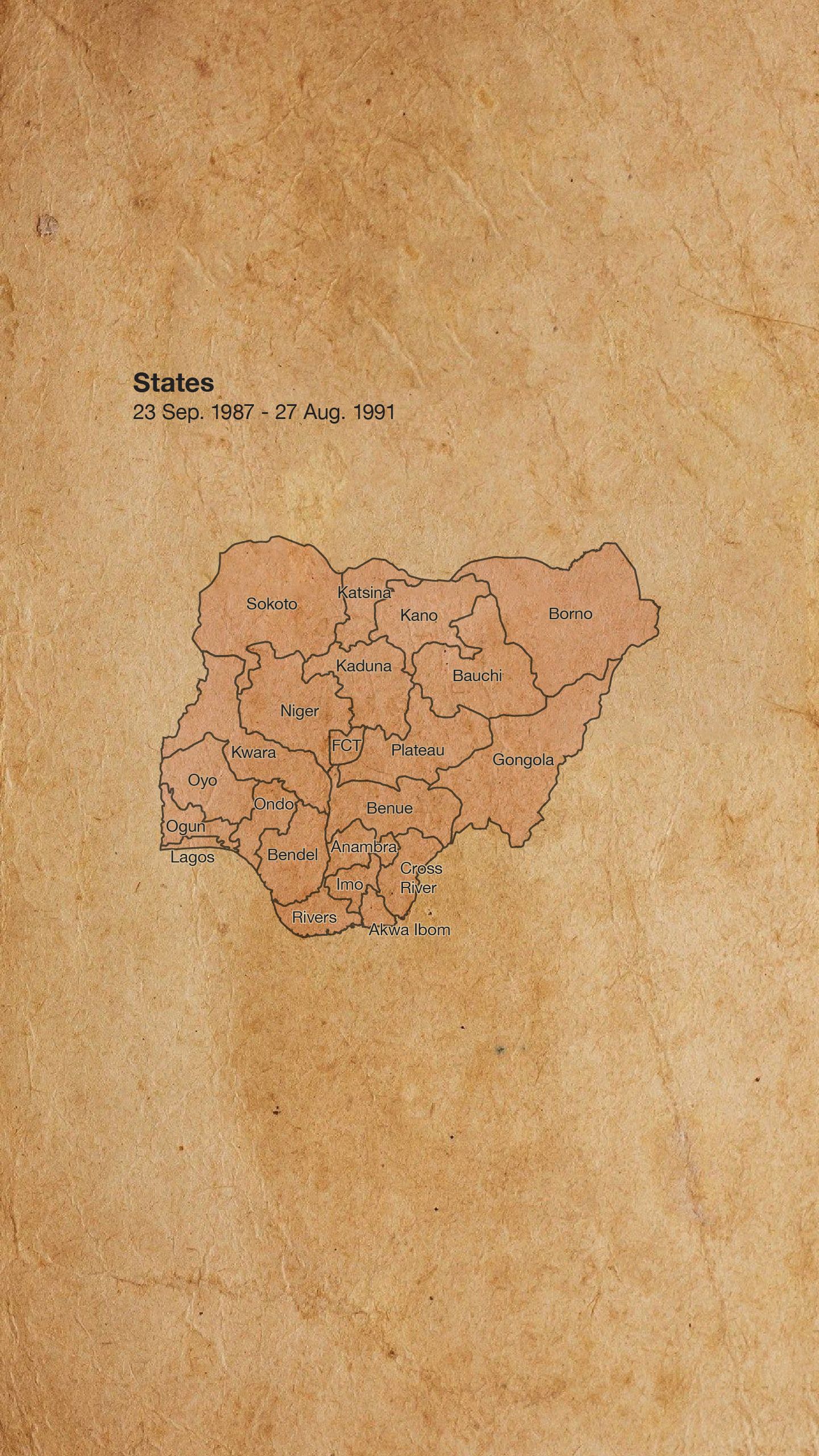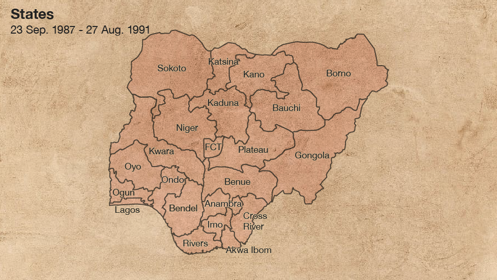 Lọdun 1987, Ọgagun Ibrahim Babangida Kede idasilẹ ipinlẹ tuntun meji sii: Ipinlẹ Akwa Ibom ati Ipinlẹ Katsina, eyi to sọ gbogbo ipinlẹ to wa ni Naijiria di mọkanlelogun.