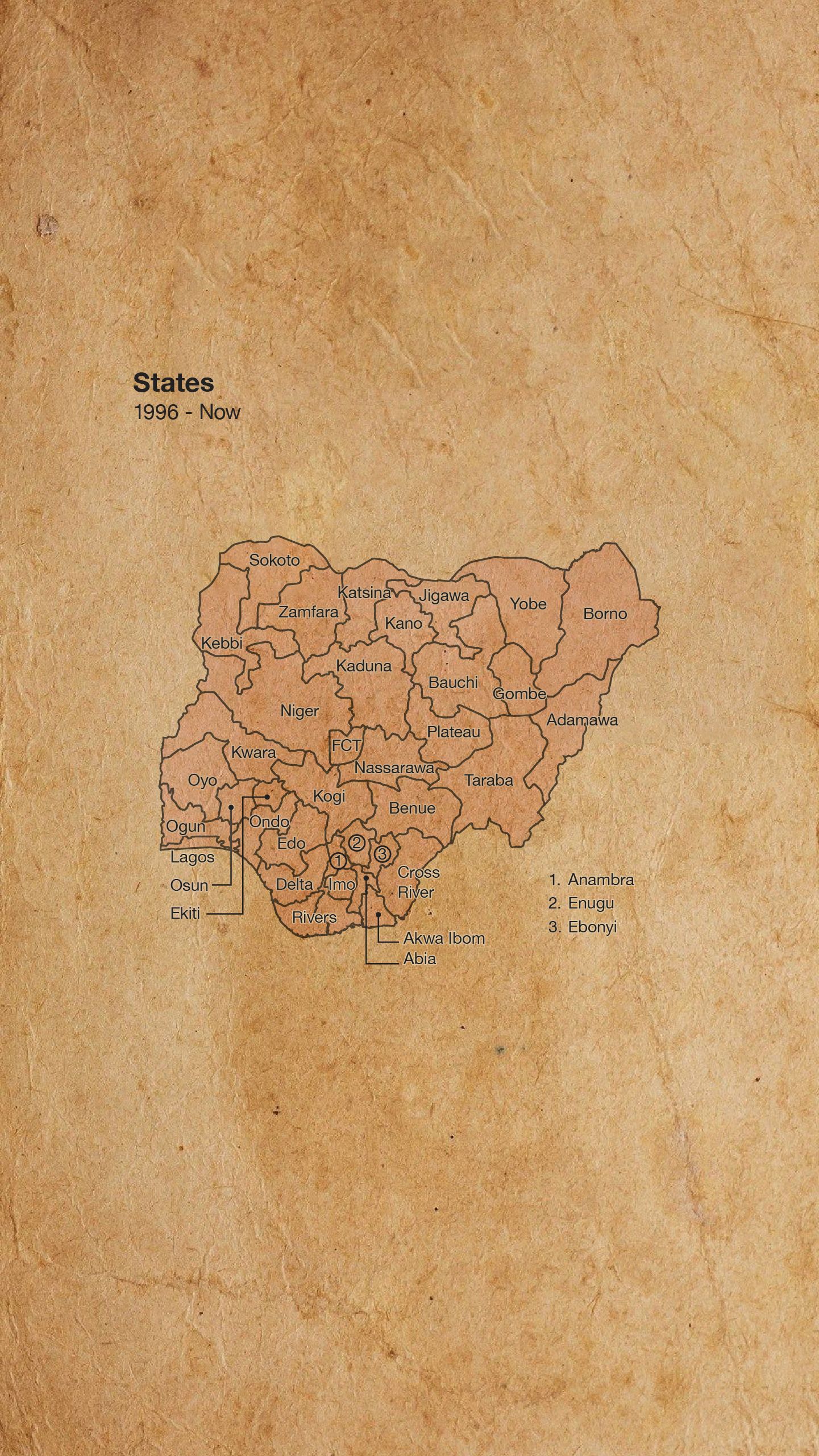 Enugu jade lati inu ipinlẹ Anambra, nigba ti Edo ati Delta jade lati inu ipinlẹ Bendel.