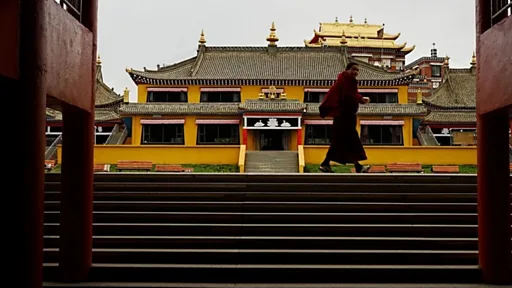 僧人們戴著象徵格魯派佛教的黃色僧帽聚集在一起。低沉洪亮的誦經聲在大殿中回盪,儀式的煙霧瀰漫在潮濕靜止的空氣中。約有30名當地男女,多身穿藏族傳統長袖外衣,盤腿而坐,直到一陣小鈴響起,誦經結束。