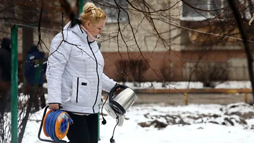 這棟大樓是蘇聯時期建造的巨大住宅區的一部分。居民仍然住在毀壞且不安全的大樓旁邊,繼續著自己的日常生活,他們走去商店或開車,裹著厚重的衣物以抵禦嚴寒。