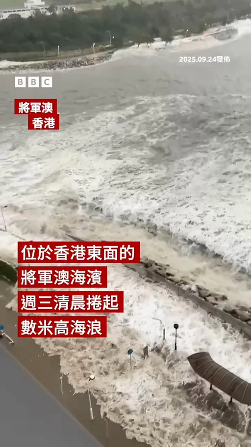 圖像加註文字,東部將軍澳海濱步道不斷遭巨浪沖刷。