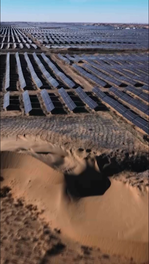 在內蒙古金色沙丘之上,一排排鋁製太陽能板吸收陽光,把這片最嚴酷的自然環境之一,轉變為全球最大的太陽能發電場之一。