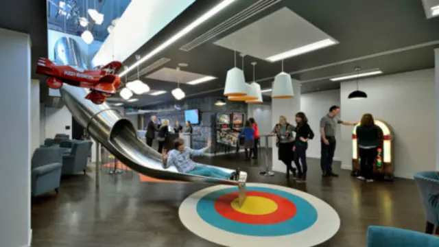 美国票务公司Ticket Master 的海外总部2013年在伦敦落成开门。公司办公室设计优先考虑的是鼓励社交。该公司办公室里最引人注目的是一个金属材料做的大滑梯。员工可以从办公区域“滑”到有点唱机,桌上足球和茶水吧的休闲区。