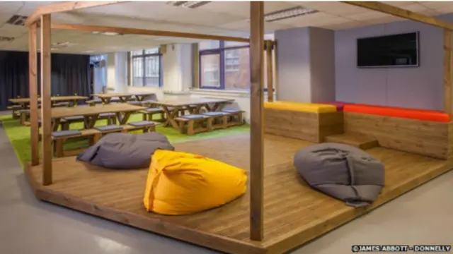 饮料公司Innocent Drinks 的整个办公室的地面,包括桌子底下都是人工草皮。办公室的茶水休息区域充满了自然光,挂着彩旗,摆着条凳,让员工们可以放松的坐在一起交谈。办公室里还有一个安静的读书角,放着各种书籍供员工翻阅。