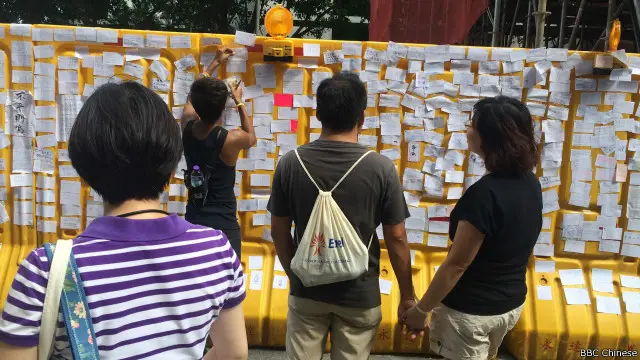 在中环政府总部外的添美道完全开放,在场原本用作阻隔的「水马」变成了民主牆,不断有人贴上对民主、集会发佔中的意见。
