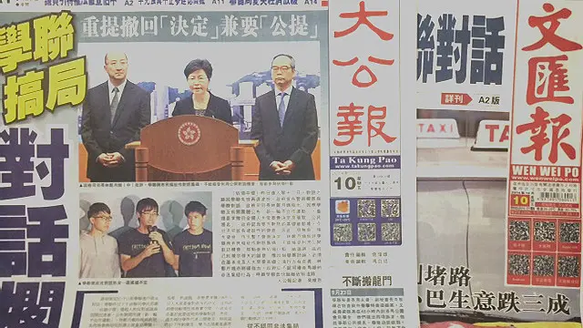 《大公报》在头版报道,学联在与政府协调商讨对话细节期间,态度摇摆不定,昨日(9日)更连同其他团体升级不合作行动,无意沟通,特区政府在无奈之下搁置对话。