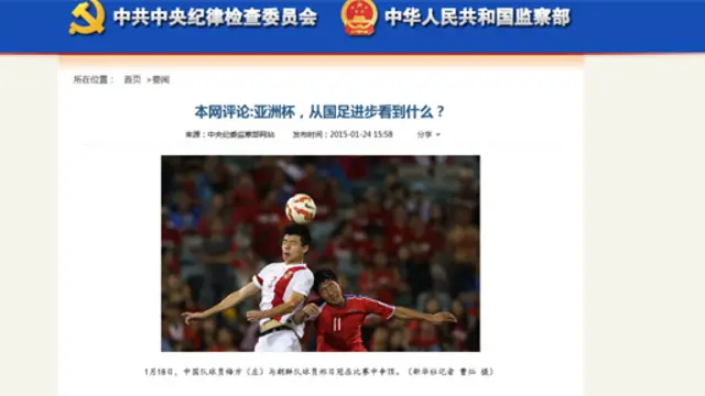 中共中央纪委监察部网站周六(1月24日)刊登评论文章,就中国男足在亚洲杯赛的表现做出点评,提及“强力反腐是催化中国足球走向新生的一个关键”。