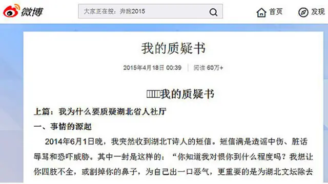 中国湖北省作协主席方方4月18日在微博上发布公开信,质疑湖北省人社厅2013年对湖北省作协副主席T诗人破格晋升的问题,并提出十点疑问。