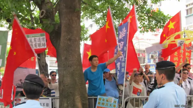 另外,还有“本土力量”成员指骂游行人士,指支联会副主席蔡耀昌帮助新移民,蚕食香港,是卖港贼,并向他们竖起中指。