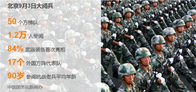 北京这次大阅兵将有1.2万名中国官兵参加,此外还有其它17个国家派军人参加,各方队将天安门城楼前通过,接受聚集在上的领导人和特邀嘉宾检阅。