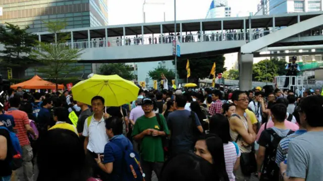 据身在现场的BBC中文网记者蔡晓颖表示,集会现场已经聚集了超过一千人,而且不同年纪的人都有,其中不少人手持象征“占中”运动的黄色雨伞及黄色横幅,也有人打出“我要真普选”的标语。