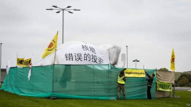在欣克利角核电站附近,反核人士打出中英双语标语,表达对核电的不同看法。