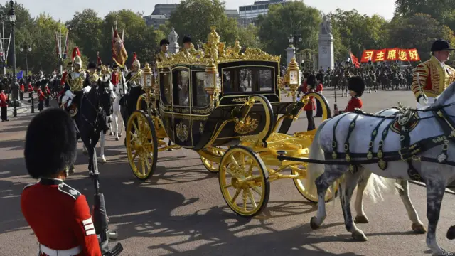 话音刚落,女王迎接习近平的马车正好驶出白金汉宫,引来一阵欢呼。女王并没有人群那么兴奋,面无表情地望着窗外。