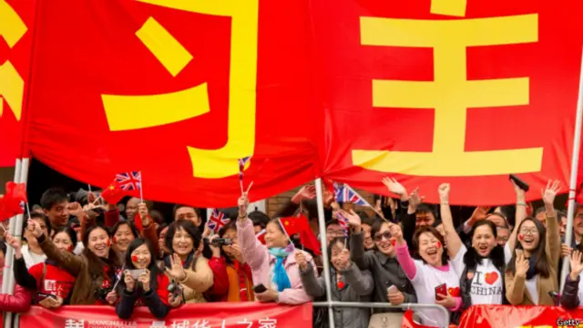 不一会,下议院演讲结束的习近平一行人走出门,抗议群体的嘘声刚起,就被两面巨大的五星红旗和一阵敲锣打鼓盖去了声势。他们无奈的望了望彼此,开始讨论晚上聚餐的事宜。