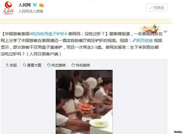 截至BBC中文网记者发稿,这段视频和相关照片在中国最大的社交媒体平台新浪微博上排名“实时热搜榜”第六位。数据显示,#中国游客泰国 疯狂铲虾# 话题已有至少20万网民阅读和参与讨论。