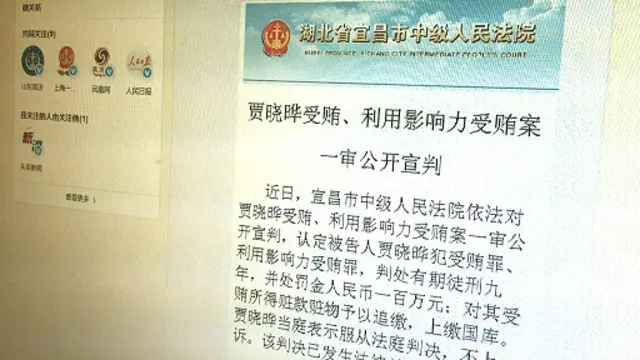 宜昌中院微博在发表时间显示为“6月8日”的微博说:“贾晓晔受贿、利用影响力受贿案一审公开宣判”,并张贴一张宣判截图。