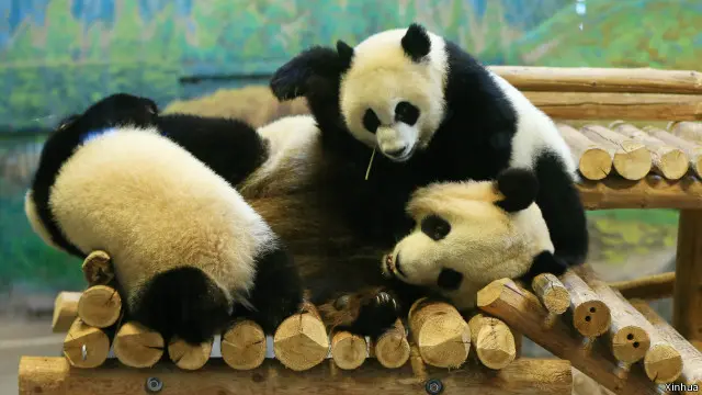 熊猫幼崽加悦悦与加盼盼在活动屋里与母亲“二顺”玩耍。