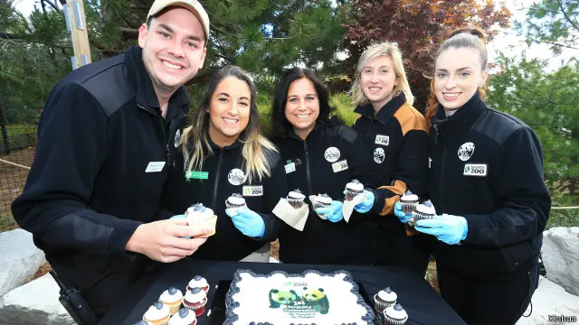 在加拿大多伦多动物园举行的龙凤胎熊猫宝宝周岁庆祝活动中,工作人员与特制的生日蛋糕合影。