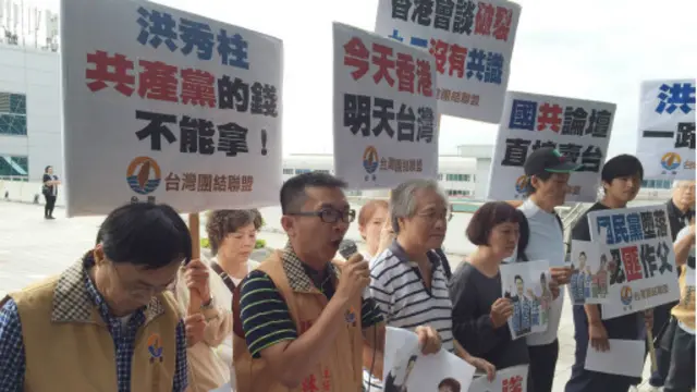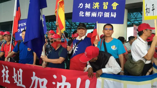 支持者高举“我爱柱姐、和平之旅”的牌子为洪秀柱访问大陆造势,并表示希望“洪习会”化解两岸僵局;反对派则斥责“洪秀柱舔共、出卖台湾”,并警告“今天香港、明天台湾”。