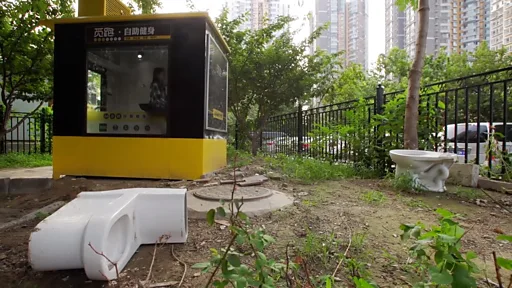 在一幢住宅大楼的前地,旁边都是废弃的马桶,李小群(音译)在跑步机上跑步。