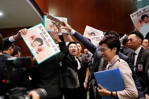 林郑月娥原定周三到立法会大楼发表《施政报告》讲话,但泛民主派议员在她准备进入会议厅前叫喊“五大诉求、缺一不可”等香港近月示威浪潮中的口号。
