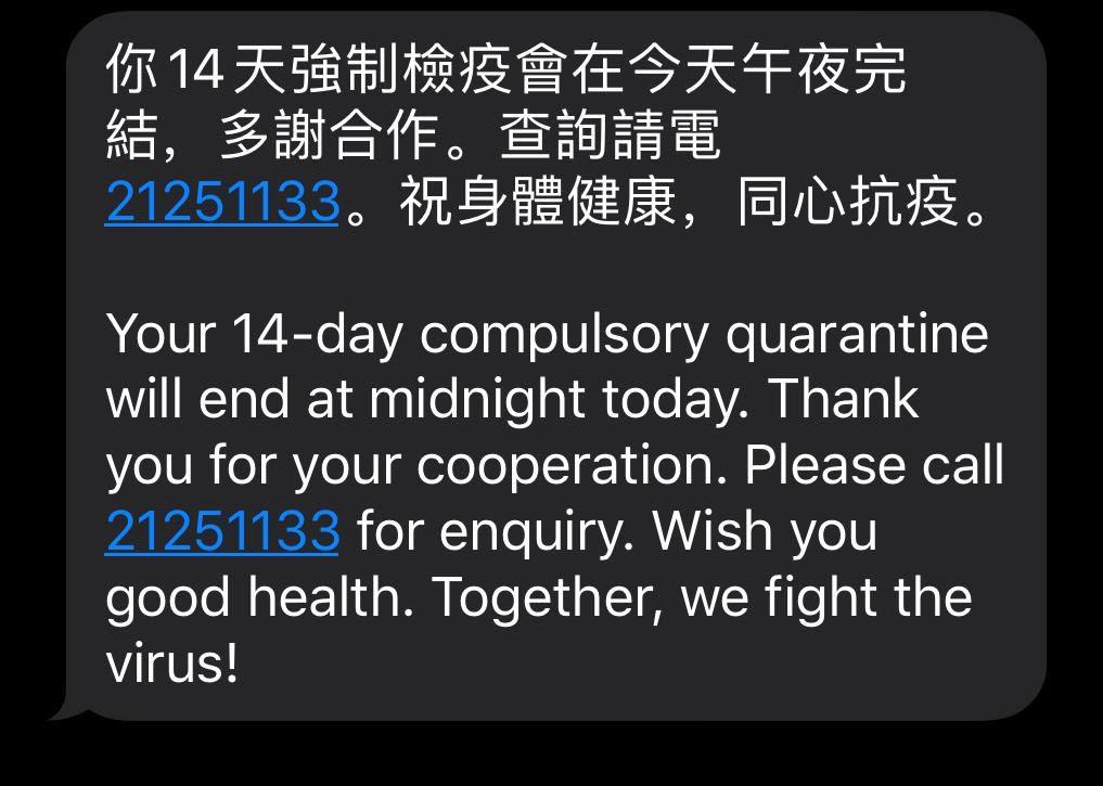 隨即收到短訊:「你14天的強制檢疫會在今天午夜完結,多謝合作。祝身體健康,同心抗疫。」