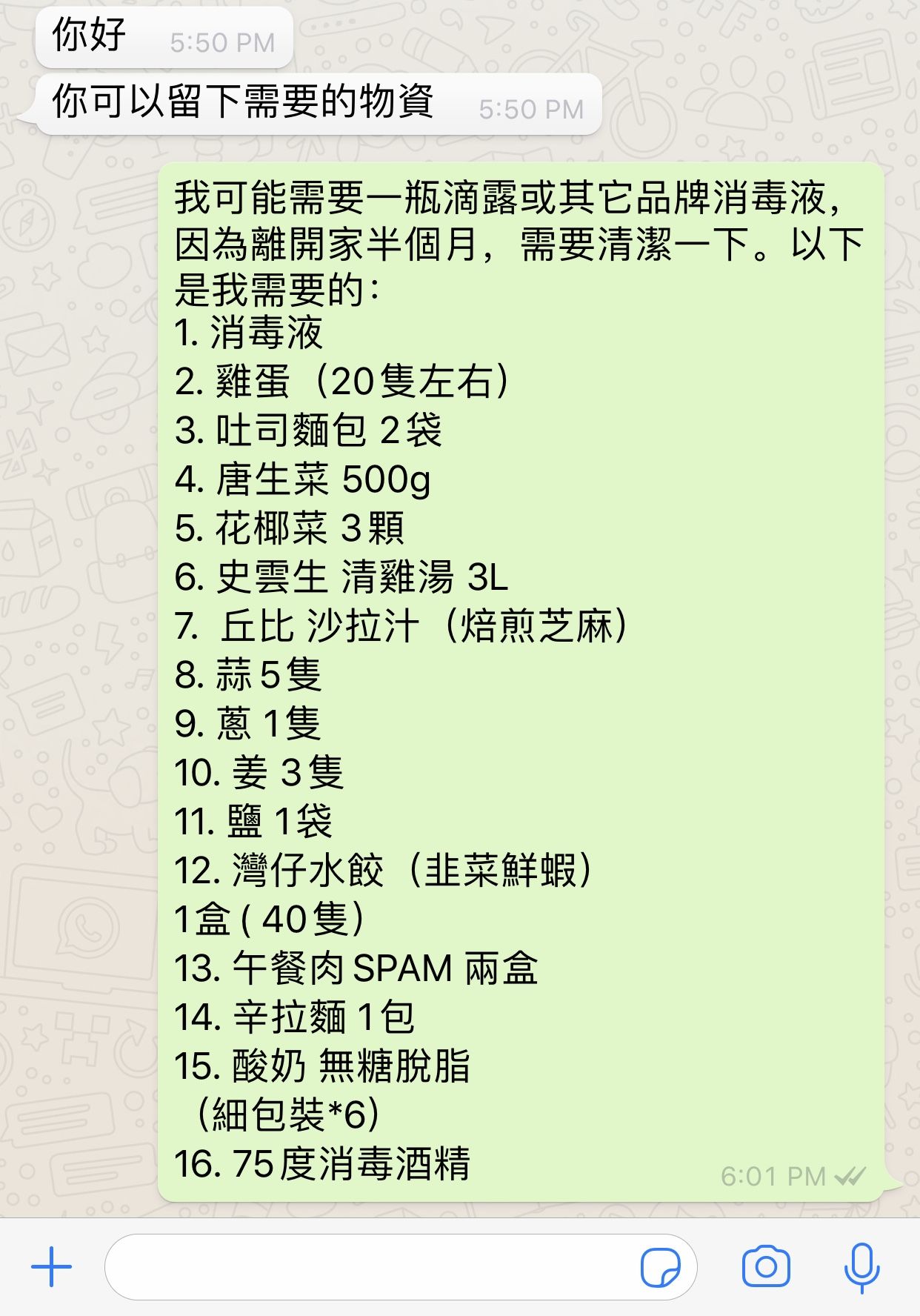 為了解決吃飯問題,我不得不給民政事務署打電話,離開香港將近一個月,家裡已經沒有吃的了。他們說由於人手的安排,只可以送兩次,每次送一個星期的食物。但要求不一定都能滿足,只能盡量。還好,他們可以送牛奶,還是脫脂的。