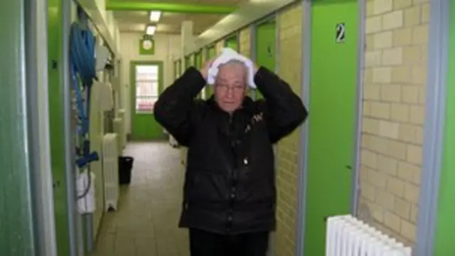 浴室内总共有九个淋浴单间,墙上贴着告示:限时20分钟。