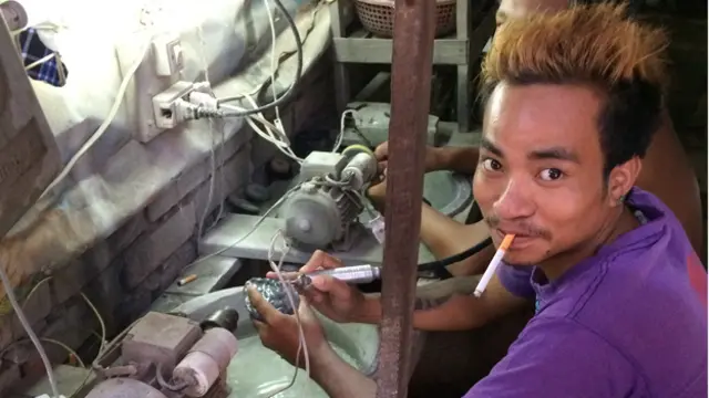 走近市场的入口,路过一些翡翠加工车间。十几岁的男孩子叼着烟,坐在飞速旋转的打磨轮前、加工翡翠原石。