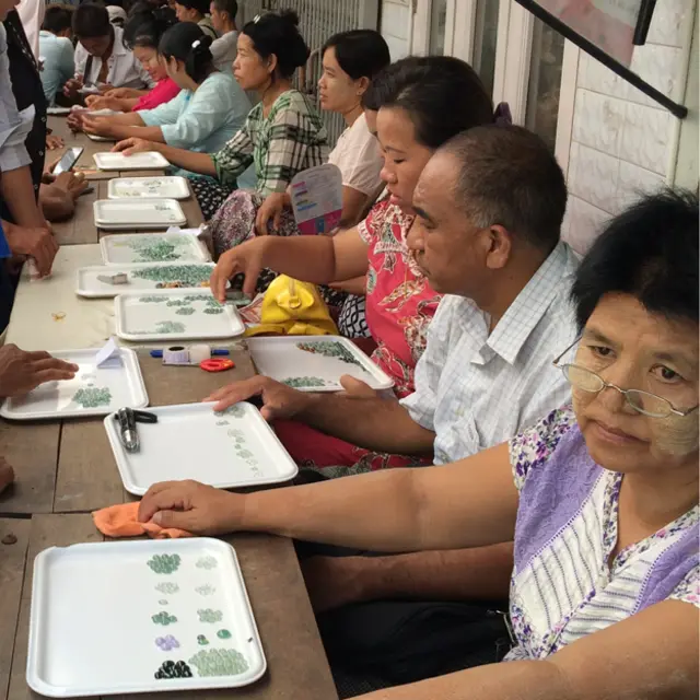 穿过市场间一条狭窄的通道,躲过一堆堆槟榔壳,我看到一个中国女人,她穿着一条绣花裙、埃尔顿·约翰体恤衫,戴着放大镜,仔细检查眼前一小堆闪亮的绿石头。