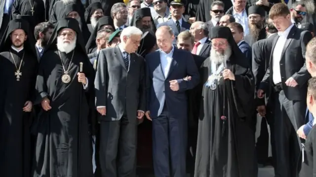 这是俄罗斯总统普京第二次前往阿索斯山上的俄国东正教修道院“圣潘捷列伊蒙修道院”(Saint Panteleimon)。