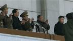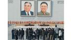• 朝鲜群众在写有“伟大的领导人金日成同志和金正日同志永远与我们同在”的大字标语下鼓掌。 (图片来源:美联社)