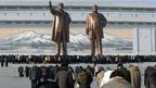 • 朝鲜民众在万寿台向开国领袖金日成(左)和前领导人金正日(右)的雕像鞠躬。 (图片来源:美联社)