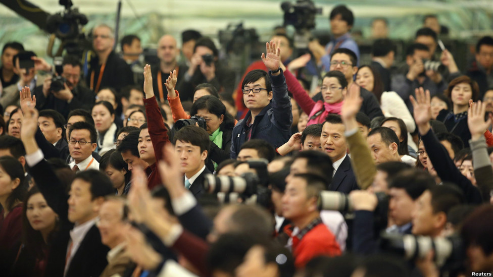 出席记者会的中外媒体记者争相举手,希望得到向李克强提问的机会。