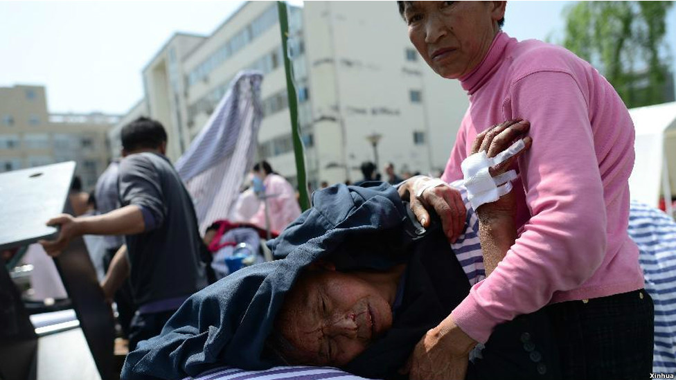 四川省已派出15支医疗队,约200人赶赴灾区。雅安市准备了18家医院准备收治伤员。成都地区准备了2200张床位收治伤员。芦山约有8万居民受灾。图为受伤居民在县医院急救处接受治疗。