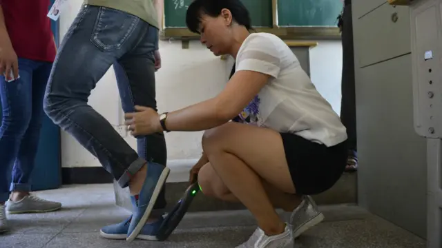 高考前一日,江西一名监考老师用探测仪检查在试场场勘的考生鞋底,以防夹带作弊器具。