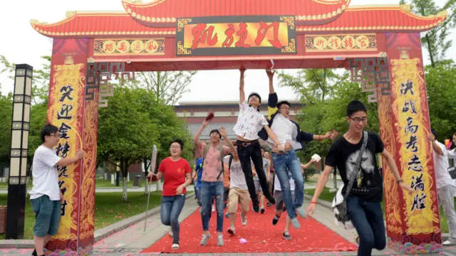 考生们在庞大压力下,出现“撕书吼楼”等“纾压”行为,<link type="page"><caption> 厦门市教育局在高考前十天发布通知“纠正”</caption><url href="http://www.bbc.com/zhongwen/trad/china/2016/05/160530_china_ban_tear_textbook" platform="highweb"/></link>。高考前夕,四川一处中学举办减压趣味活动,高三学生冲过“凯旋门”,以轻松的心态迎接高考。