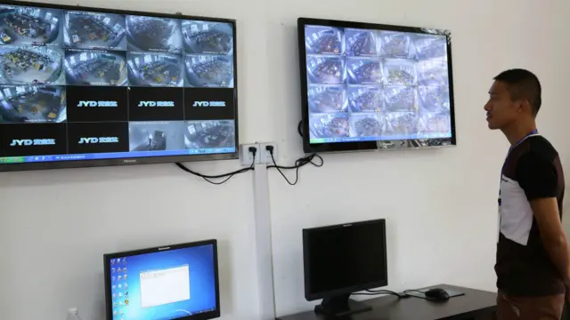 各考场严加打击作弊,广西柳州市一处考场的考务人员在监控室观看考场录像。