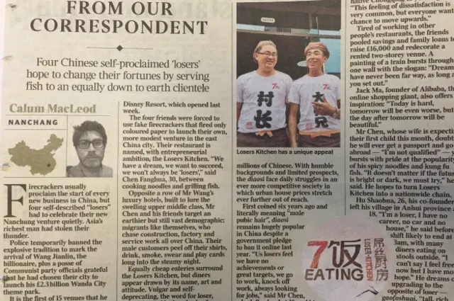 “屌丝厨房”在江西南昌开店。《泰晤士报》报道了四位自封“屌丝”的朋友开饭馆创业的故事。