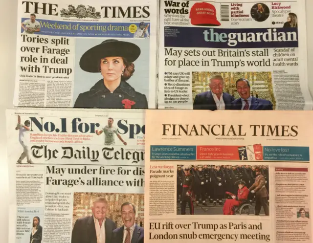周一(11月14日),英国报纸特别关注特朗普在当选美国总统后会见的第一个外国政界人士是英国独立党党魁法拉吉,而首相特里莎·梅不愿利用二者之间的密切联系为今后的英美关系牵线搭桥。