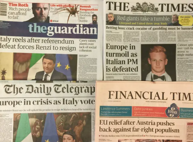 周一(12月5日),英国媒体关注意大利总理倡导的修宪公投遭否决, 欧洲金融市场动荡,政治前景堪忧。