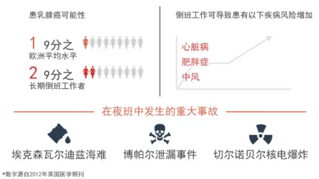 违反人体生物钟的作息规律造成的其它健康损害,从乳腺癌到肥胖症,已经为人所知。