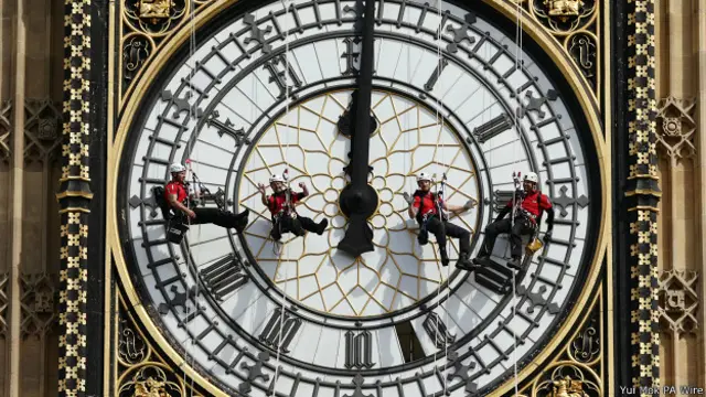 大笨钟共有四面,每个面上都有312片蛋白石玻璃,清洗作业需要专业人员绑着绳索悬吊在大笨钟上进行。预计要花上一周时间,大笨钟才能再度干净的面对游客。