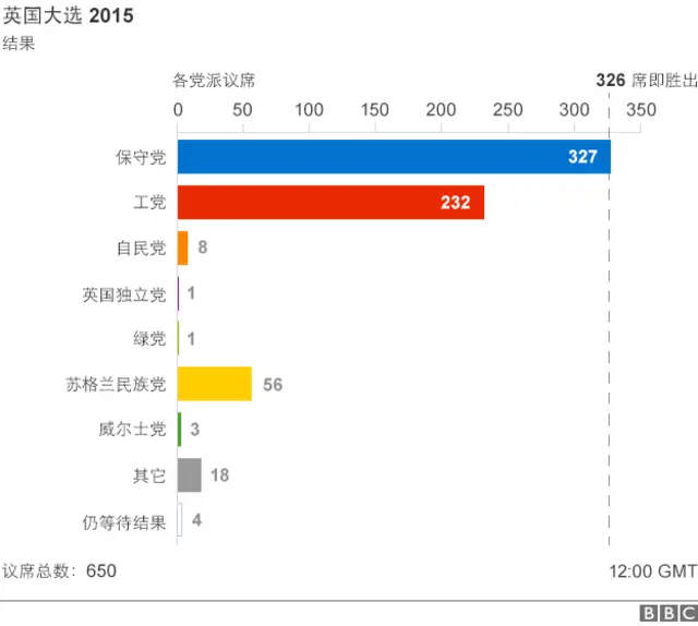 英国大选所有650个选区还有一个选区尚未宣布结果,而执政保守党已经获得了330席,超过所需要326席多数议席数目,因此可以自己独立组阁,无需与上届大选那样与其他党派组成联合政府。
