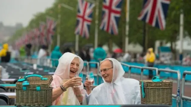 伦敦万人冒雨聚餐为英国女王庆祝生日