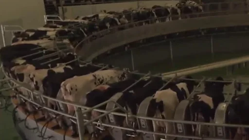 在大漠深处,一个设有空调谷仓内,一头母牛踏上了一个制作精良的机械圆盘传送带,一个挤奶装置被连接到了它的乳房上。