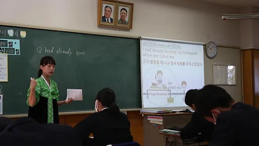 “金先生善良又努力,朴先生贪婪又狡猾,”老师将这段文字写在了黑板上,转身在手提电脑上按下了播放键。一个低沉的男声从扩音器里传出来,学生们跟着念。