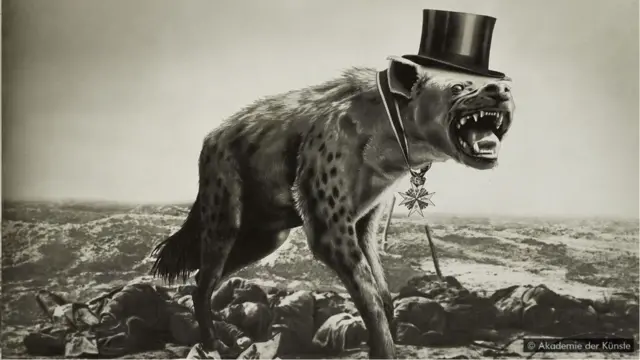 在其他照片里,这位独裁者被还原成一个拿着剑的木偶,在叼着雪茄的商人蒂森手中。他张开的腿和胳膊使他骄傲的表情变得荒谬可笑。